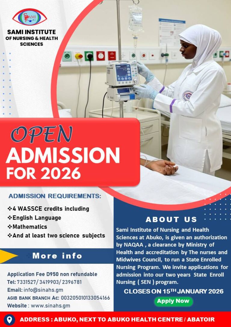 I have the pleasure to introduce to you Sami Institute of Nursing and Health Sciences which was founded in 2016 in the Gambia. After serving in the United Kingdom in the National Health Service (NHS) for 15 years, in addition to 10 years of earlier service in the health system and medical practice in The Gambia,